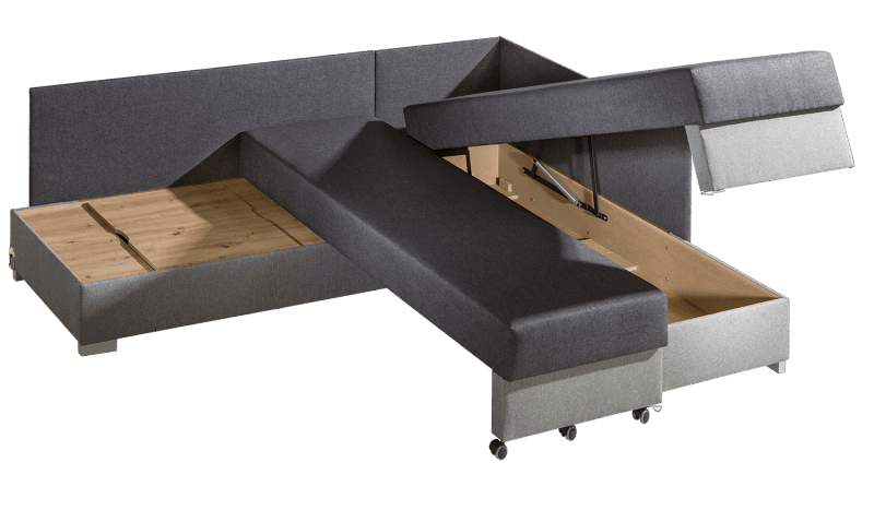 Narożnik z funkcją spania, pojemnikiem i chowaną ławą.